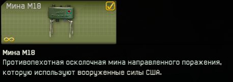 Класс: инженер Тип оружия: взрывчатка Зона срабатывания: 180° История: Разработана американским конструктором Норманом Маклеодом в начале 1950-х годов. Была принята на вооружение армии и Корпуса морской пехоты США. Изначально применялась для охраны опорных пунктов и постов американских подразделений во Вьетнаме. Минами обставляли подходы к опорному пункту и взрывали их при угрозе приближения противника. Это обеспечивало надежную защиту ключевых объектов, особенно в ночное время. В то же время мины были безопасны для своих солдат, приближающихся к опорному пункту, так как подрыв осуществлялся дистанционно. «Клеймор» оказалась весьма эффективной и значительно снизила активность вражеских солдат. Внешний вид: M18 имеет форму изогнутого параллелепипеда. Корпус боевой мины сделан из зеленого пластика, в то время как корпуса холостых и тренировочных мин – из синего. Устанавливается выпуклой стороной в сторону противника. Внутри устройства расположено около 700 готовых убойных элементов в виде стальных роликов и шариков диаметром по 5,5 мм. При взрыве мины образуется пучок убойных элементов, летящих на расстояние до 50 метров. Высота пучка - не более 4 метров. Описание: Изначально мина не имела собственного взрывателя. Предполагалось, что M18 станет исключительно управляемой и подрыв будет осуществляться оператором в тот момент, когда солдаты противника окажутся в зоне поражения мины. Для установки и определения зоны поражения в верхней части устройства расположен прицел. Мина устанавливается на землю на четырех ножках или же с помощью входящей в комплект струбцины крепится к местным предметам (столбы, стенки, стволы деревьев и т. п.) В процессе эксплуатации к мине стали прикреплять взрыватели обрывного и натяжного действия, используя ее как взрывное устройство двойного действия. В отличие от реального прототипа мина в Warface оборудована лазерными сенсорами. Интересные факты: В СССР переняли опыт западных оружейников, и в 1966 году для Советской Армии был разработан аналог M18 под маркой МОН-50. Вскоре подобные взрывные устройства стали появляться и в других странах. В частности, в Югославии (MRUD) и Швеции (Type 13 и Type 21). Во Вьетнаме были зафиксированы случаи, когда особенно ловкие и дерзкие вьетконговцы подкрадывались к установленным минам и разворачивали их в сторону американских солдат. После этого они показывались на глаза последним, провоцируя противников на подрыв устройства. Особенно прославился 16-летний вьетнамский разведчик Нго-Тинь-Цзям, однажды все же угодивший в ловушку. Американский инженер поставил 2 мины на один провод, и Нго-Тинь-Цзям, погиб, не заметив вторую мину. Информация была взята с официального сайта игры - wf.mail.ru