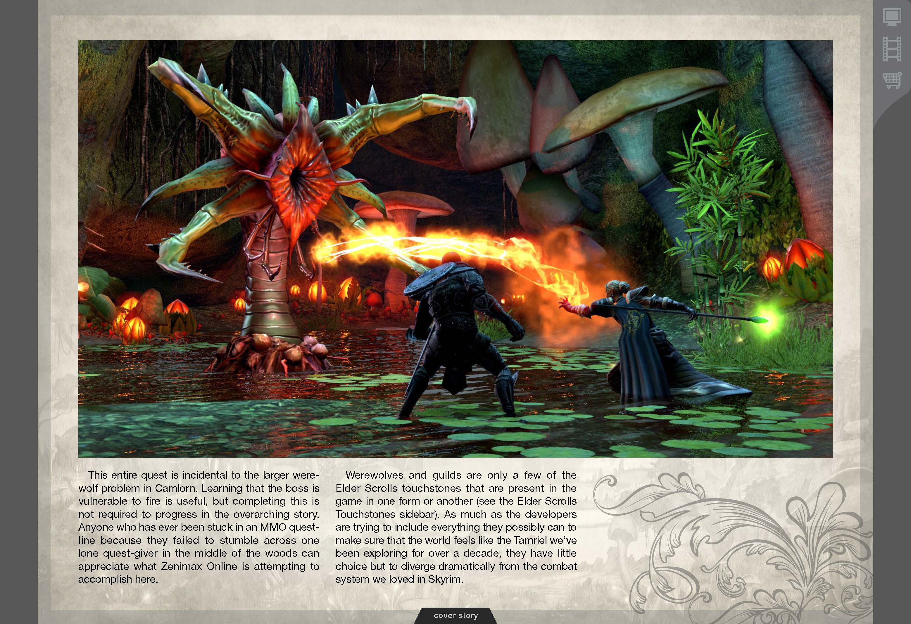 Доброго времени суток, гладиаторы. В скором времени, возможно, свершится то, чего ждали многие фанаты серии ролевой игры The Elder Scrolls. Сегодня в сети появились первые скриншоты и сканы журнала Gameinformer, на которых описывается мир TES Online. Пол Сейдж, креативный директор компании Zenimax Online, в своем интервью для этого журнала заявил, что они собираются взяться за игру совершенно по новому, в частности - за переход мира игры в mmo-среду. Главная задача разработчиков - аккуратно перенести все, за что так полюбилась эта серия игрокам, все самое лучшее, например, отличную боевую систему и большой и интерактивный мир, наполненный персонажами и всякой нечистью, которые адекватно взаимодействуют с игроком. Цитата: