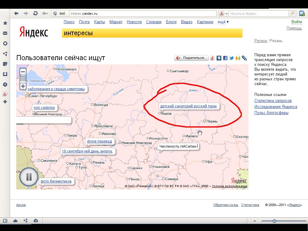 Всем доброго субботнего вечера, я конечно понимаю что вы сейчас надеваете чистые трусы, которые постирали специально к этому моменту, ищите носки которые можно хотя бы без труда сложить вдвое и брызнуть дезодорантом что бы воняло говном а не эпичекой мертвячинкой. Клянчите у родителей пятишку с обещанием, что когда закончите школу обязательно отдадите. Сбриваете волосы с подмышек что бы не выпирали из под свитера и начищаете черные зубы пастой. Потому как многие из вас готовятся к субботнему бухычу и гулянкам, дабы в понедельник рассказать одноклассникам как отлично полапали Нинку за сиськи. Но как там не крути придется задержаться перед монитором и отложить поход в местный Дом Культуры. Потому, что я вам расскажу про одну охуенную тему, от которой не могу оторваться уже неделю. Все вы знаете что такое Яндекс и что в нем ищут. Так вот поискобляди запустили охуенную тему, а именно поисковую карту. Теперь в реальном времени на карте мира вам будет показывать кто что ищет на данный момент. Я лично орал от запросов, особенно когда появился запрос на Кавказе что кто то ищет "порнуху в платках" ![]() В общем посмотреть тему можно тут: http://interes.yandex.ru Предлагаю всем скринить самые веселые запросы и выкладывать сюда, вот пара таких веселых запросов которые на дваче успели заскринить)