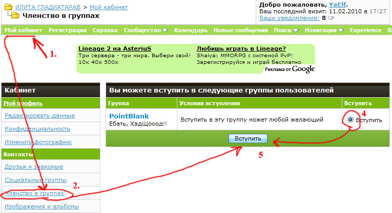 Дорогие пользователи, у нас появилась теперь публичная (то есть обычную группу на нее сможет сменить каждый) группа, посвященная игре PointBlank, для того, что бы заменить существующую на эту, нажмите "Мой кабинет" далее в меню в разделе "Контакты" - "Членство в группах", далее выбираем группу PointBlank ставим галочку жмем обновить и потом заменяем обычную на новыую, в общем смотрите скрины, там все подробно указано: