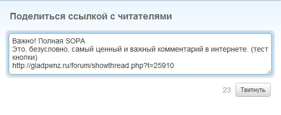 Привет вам, гладовчане! Давно я не появлялся на GLADpwnz и еще давнее не публиковал новости о портале и его трансформациях. Что бы несколько разбавить затишье, мы, с помощью клавиатуры и какой-то матери, наладили контакт любимых Гладов с самыми «значимыми» социальными сетями — Google+, ВКонтакте, Facebook и, конечно же, малюткой Twitter. Результат вы можете видеть... да хоть прямо сейчас. Если вы слоу не заметили изменений, вот они. Теперь вы можете мгновенно поделится любой волнующей вас темой с вашими друзьями, однопартийцами, пасанами с раёна и даже бомжом Василием. (администрация GLADpwnz предупреждает, что Василий должен иметь компьютер и доступ в интернет) Я предлагаю пройтись по списку социальных сетей и наглядно (в красивых картинках, да) продемонстрировать новые возможности. Google+ Молодая и быстро развивающаяся социальная сеть от (вы не поверите!) Google. С ней связано много надежд, как и с самим Гуглом, и я просто не мог пройти мимо неё (него?) стороной. Одно из главных преимуществ её кнопки «+1» — возможность самому на месте выбрать картинку, которая будет сопровождать ваше сообщение из нескольких первых больших картинок на странице. Итак, при нажатии на «g +1» вы увидите: Здесь можно сразу вписать свой комментарий, выбрать картинку и параметры просмотра — какие пользователи будут видеть эту запись, а какие нет, и сразу отправить её в свою ленту. ВКонтакте Находясь в русском сегменте интернета просто невозможно было обойти... эту социальную сеть стороной. У неё есть много своей специфики, но для многих она стала той Единственной и Неповторимой. Правда, возможности её кнопки по сравнению с «+1» несколько малы. Вы можете отметить тему как «понравившуюся» и поделится ей с друзьями — это заклинание означает «разместите это на моей стене, пожалуйста». Что сказать, исчадие Марка Цукерберга, самая популярная в мире социалка на данный момент со своими 750.000.000 миллионами уникальных визитов в месяц. Посмотрим, удастся ли Google переплюнуть этого монстра. А пока, запасясь попкорном, можно срать делиться новостями GLADpwnz и там. Если нажать кнопку, можно сразу оставить комментарий этой ссылки. Так-то! А вот так ваша запись будет выглядеть в их новых «хрониках». Ну и милашка Твиттер. Ну он просто милашка. Хотя, говорят, нерентабелен и его разработчики уже два года не могут придумать, как сосать бабло из его микроблогов. Как по мне, так лучше, что бы разработчики вообще ничего не сосали. Для здоровья плохо. Надеюсь, этим маленьким дополнением мы смогли несколько разнообразить и без того весёлое пребывание на Гладе. Больше обновлений скоро.
