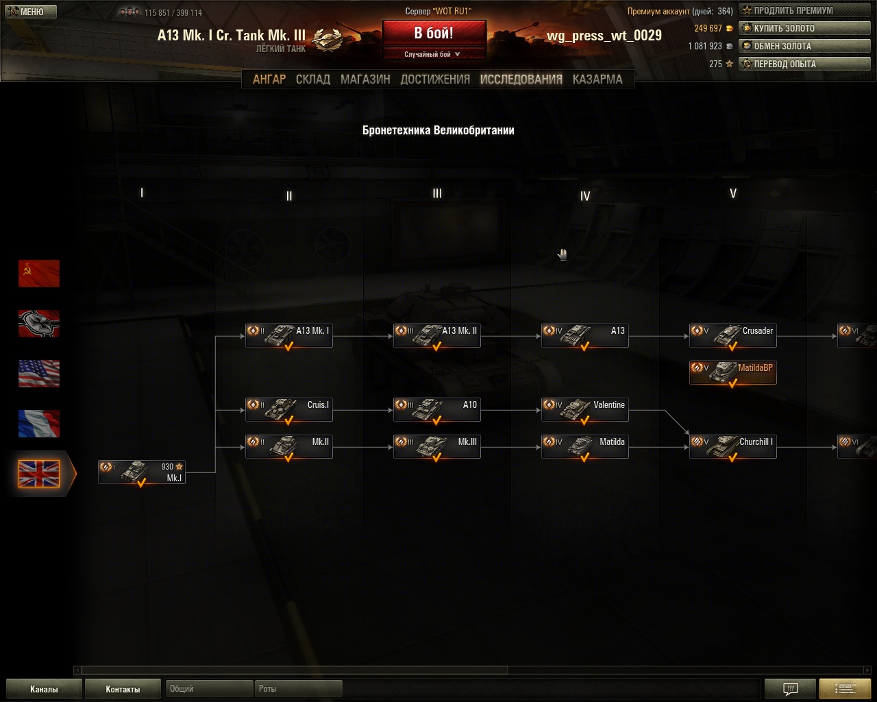 Буквально вчера я рассказывал вам, что вышло новое обновление, имеющее название 0.8.1. Главным событием явилось введение Британской нации. Безусловно, многие ждали столь "интеллигентную" нацию. Теперь вы сможете рассекать по районам еле-еле, посасывая очередную чашечку кофе у себя в кожаном кресле. Сегодня я немного расскажу о том, что же такое Британия в общем и подробно остановлюсь на ветке средних танков. Пока в игре присутствует только 2 ветки танков. Хочу сказать, что Британские танки- это, прежде всего, эталон скорострельности и точности. С их вводом игра станет более "подвижной". Ветки данной нации вы можете просмотреть ниже: А теперь перейдем к ветке средних танков. Что же они из себя представляют? Во-первых, это просто пиздец какая охуенная скорость поворота корпуса. Она поражает, серьезно. Во-вторых, это очень приличная скорость в 50-65 км/ч. Астрономически! В-третьих, я просто ссался кипятком от точности орудий. Они в этом плане превзойдут даже немцев, на мой взгляд. "Но чем-то же должны британцы пожертвовать?"- спросите вы. Да, уважаемые, взамен, британцы лишились хорошей брони (хотя иногда она спасает) и лишились хороших, альфа-дамаговских орудий, за исключением топовых танков. В итоге, у нас получаются быстрые танки, готовые к переброске с фланга на фланг, способные обескуражить противника своей скорострельность и маневренностью. Medium Mark I Как вы поняли из названия, уже на первой уровне нас ожидает средний танк. Несомненно, для мира танков это нонсанс! Он обладает хорошим вооружением, наносящим дамаг, внимание, в 70-90 единиц! Взамен, этот танк стал самым медленным и малобронированным в этой ветке. A13 Mk. I Cr. Tank Mk. III Обычный танк 2 уровня, со своеобразным "барабаном". С него и начинается познание всей ветки СТ. Именно он- первая машина, которая поразит вас своей скоростью, скорострельностью и маневренностью. Машина предназначалась для прорыва обороны противника и послужила основой для создания целого класса крейсерских танков. Как вы уже поняли, Британия- страна с очень необычными танками. И вот, уже на 3 уровне нас ожидает новинка. Этот танк имеет "барабан", что-то между барабаном у французов и барабаном у лоу-левелов других наций. А именно, данное топовое орудие разряжает барабан 2 выстрелами, но в каждом выстреле вылетает 2 снаряда! Поясню. Сначала ты стреляешь, думаешь, что попадет 1 снаряд, и вдруг, через секунду вылетает еще 1 снаряд с таким же дамагом. Похожего нет ни у кого. Но мы идем дальше. Еще одна необычная машина. "Почему?"- спросите вы. Да все потому, что он стреляет не как остальные танки. Полет снаряда напоминает слэм-данк в баскетболе, что-то типо "навеса". Очень непривычно. вам предстоит научиться стрелять на упреждение. Хорошо стрелять на упреждение. Урон же желает оставлять лучшего, но все равно, машина довольно-таки интересная. Хотя бы потому, что она имеет большой выбор вооружения. Этот танк идеально подходит для изучения разных тактик боя. Также, можно выделить хорошее бронирование бортов. И з недостатков я выделю, что танк пожароопасен и все-таки уступает по скорости своим меньшим братьям. С этого танка начинаются самые известные машины ее величества. Да, как и предыдущие 3 машины- это ЛТ. Но это интересный ЛТ. на этом танке я действительно вдоволь понарезал круги на одном месте и понавтыкал противникам. Идеально подходит для удар