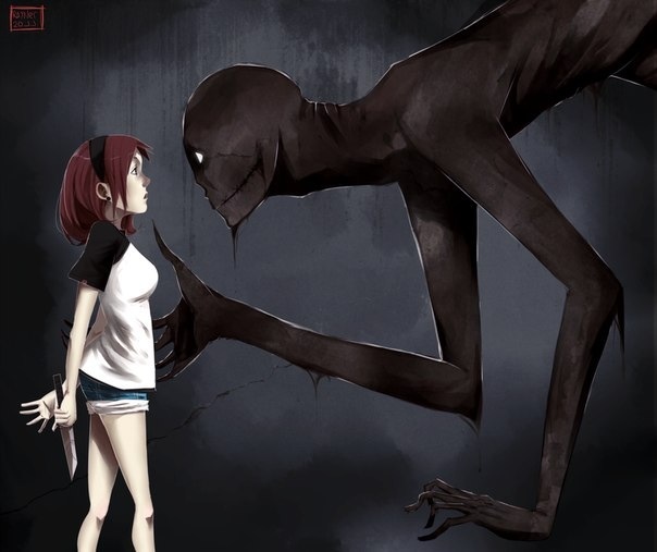 Снимаешь наушники и сонно трёшь глаза. Уже два часа ночи, но тебе плевать. Допиваешь остывший кофе и бредешь на кухню. Вдруг спиной чувствуешь пронзительный взгляд. Резко разворачиваешься и всматриваешься в темноту коридора. Никого. Списывая всё на глюки и недосып, начинаешь мыть посуду. Родители уехали в гости и вот уже второй день ты дома один. Решив, что пора спать, уже собираешься уйти в комнату, но тут ты слышишь, как что-то скребется в спальне родителей. Червячок страха уже пробрался в твоё сердце, но ты принимаешь решение, что это крыса. Выключив свет и пройдя в коридор, резко останавливаешься. Крик ужаса застыл в твоём горле. А причина в нем. Высокое безносое нечто с длиннющими руками и полусгнившим телом внимательно смотрит на тебя. Его рот открыт и даже в темноте ты видишь острые, как у акулы, зубы. Оба смотрите друг другу в глаза. Оцепенение проходит и ты, забежав в комнату, тут же строишь баррикады. Оно скребется в дверь, что-то бормочет. А ты только сейчас почуял, что от него воняет гнилью и землёй. Паника накатывает с новой силой, когда в двери образуется маленькая щель, которая становится всё больше. С ужасом смотришь на громадные когти, щипаешь себя, надеясь, что это просто кошмар. Но это явь и от этого становится ещё страшнее. Бежишь на балкон и прыгаешь, когда неведомая тварь, наконец, освобождает себе путь в комнату. Спрыгнув со второго этажа, ты воешь от боли. Неудачное падение и сильнейший вывих. Твари не видно. Падая и шипя от боли, ты бежишь к соседнему подъезду и звонишь по домофону в первую попавшуюся квартиру. Кричишь, ревешь, умоляешь спасти. На том конце провода что-то кричат про милицию, а ты уже скребешься в железную дверь. Оно всё же вылезло на балкон. Теперь в свете фонаря, ты видишь его во всей красе. Абсолютно голое бесполое существо. Куски кожи, висящие на полусгнившей плоти, служат ему своеобразным плащом. Полное отсутствие носа и губ, в глазницах лишь белок. Ты кричишь с новой силой и тут железная дверь открывается. На крыльцо выбегают мужчина и женщина. Подхватив тебя и унося в своё жилище, они задают множество вопросов, а ты лишь плачешь как маленький. Через двадцать минут приезжают скорая, милиция и твои родители. Уже после тебе расскажут, что была разгромлена только твоя комната, причем повсюду валялась земля. В коридоре нашли растерзанную крысу. Следов взлома не было.