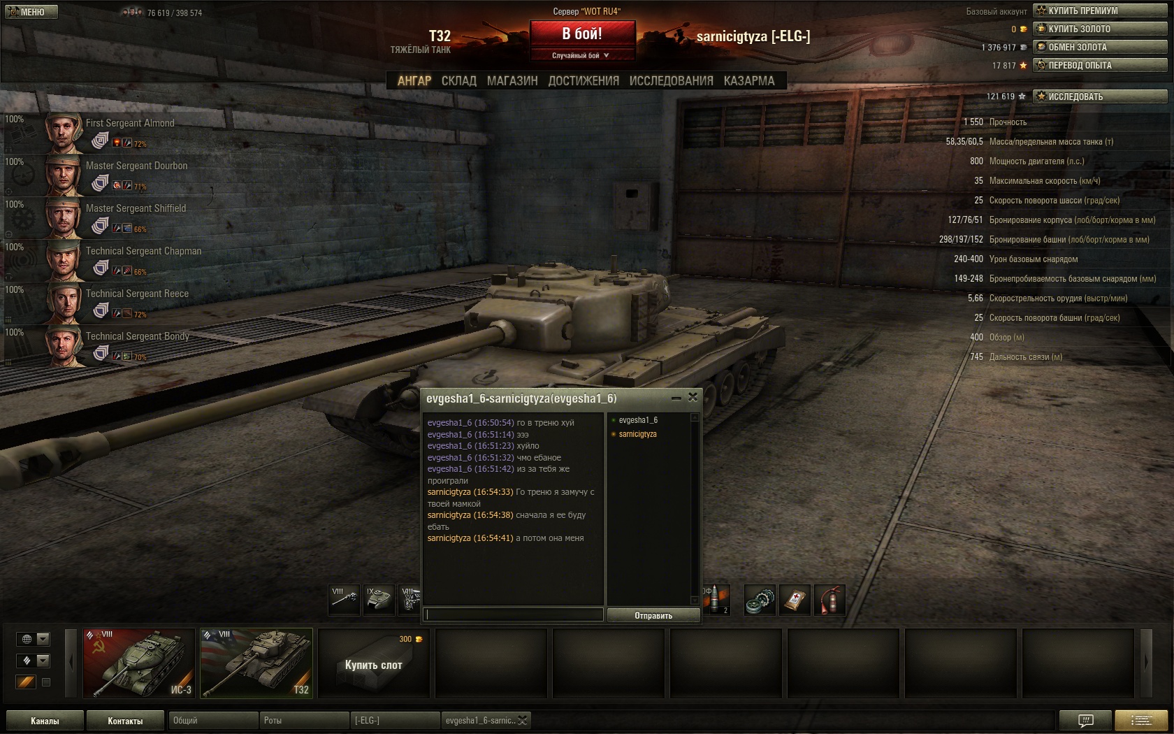 Энск, я на Т32 в топе. Еду в город параллельно с КВ-5, но этот еблан постоянно меня подпихивал в бок и не давал маневрировать. Потом встал сзади меня и начал выпихивать на врагов. Пишу в чат, что разъебу его, если не перестанет. В итоге слил пол хп, потому что не мог отъехать, заехал ему в попца и начал держать его на гусле В итоге его распидорасили враги под его нескончаемый бугурт в чате. Но потом приехал его совзводный и пытался тоже самое со мной проделать. Но промахивался по гусле (пару раз поставил, потом промахивался) и в итоге меня разобрал.