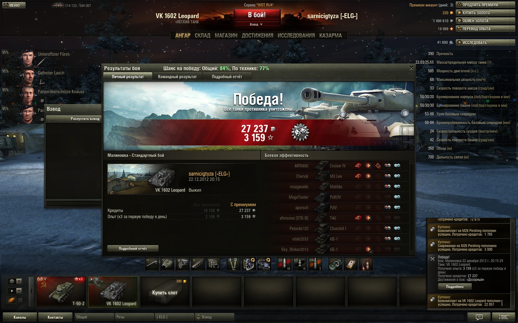 Бой: Заполярье 22 декабря 2012 г. 20 24Танк: VK 2801 Получено опыта: 5394 (x3 за первую победу в день) Получено кредитов: 32557 Достижения в бою: «Дозорный» |