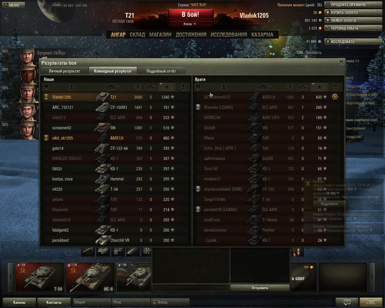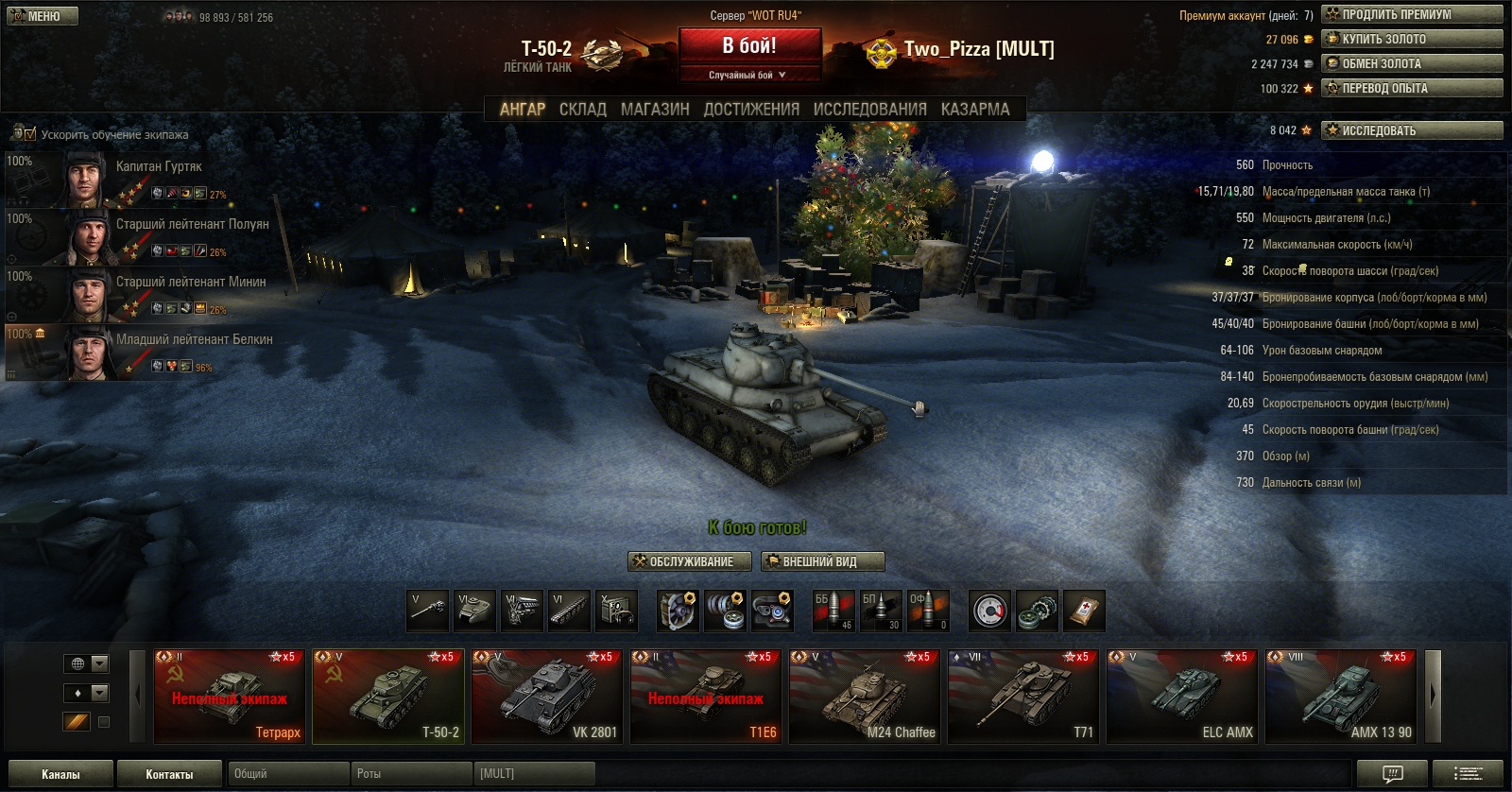 Купил ёлку и 50-2, продавал их по акции за дарма чтобы освободить под шмалю и дикера слоты, назад вышло почти 1кк. Купил Джамбо, Федю, Чаффи и оборудование на них и те танки, которые пылятся в ангаре т.к. проще потратить 10 голды и дождаться акции. Купил расходников на 3кк. Ещё смотрю на сербоголду, но что-то лень потом фармить, т.к. надо будет довольно скоро брать т69.