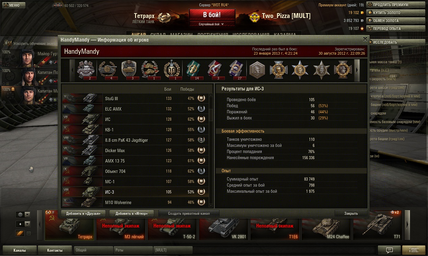 На тройке я играл в основном только на звездах. танк отличный, не спорю. Но мне на нем как-то не интересно было играть: броня, пушка и динамика, все было на высшем уровне, но все это делало его имбовым, чтоли, и слишком легко было на нем играть, и в то же время скучно. В итоге я его продал, на нем 60к опыта сейчас, и я не горю желанием выкачивать дальше. |