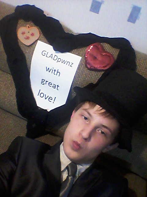 Господа, за неимением второй половинки вынуждаю себя отправить лишь свое фото. В качестве девушки прекрасно сойдет неописуемое сооружение в виде сердца из носков или же шляпа из высших слоев интеллигенции.