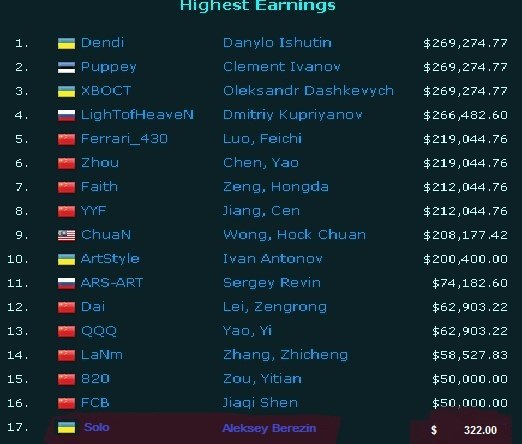 СОЛО ПОДНИМАЕТ БАБЛА, ВИЛАТ УЗНАЕТ, СТРОЧИТ ГНЕВНЫЕ АНОНСЫ, ЖИР С ВОЛОС КАПАЕТ НА КЛАВУ, РОКС КИС БАНЯТ НА САЛОЛАДДЕРЕ. НА ПОДНЯТОЕ БАБЛО СОЛО ЕДЕТ В КИТАЙ. ДАЕТ ПО ЕБАЛУ LONG DD. СТАНОВИТСЯ ВМЕСТО НЕГО ТРЕНЕРОМ LGD. ВЫИГРЫВАЕТ С НИМИ ТИ3. ВИЛАТ ПИЛИТ ВЕНЫ ОТ ЗАВИСТИ