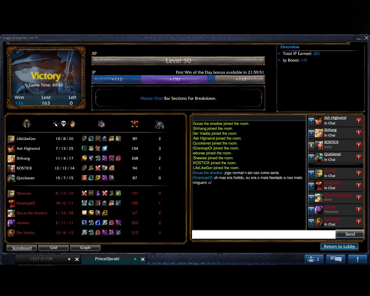 ![]() Играл щас бой непонятно чего, сначало я с костиком пошли на топ против джарвана/соны, которых ебали 7-0 на нашей стороне только, снесли первые башню, в итоге был счет 14-1, там посоны убивали все дела, но блять в мас замесе, я увидел всю силу юзелес люксы, которая кидала ульт вначале, и не кидала клетки, и тут нашей тиме надо вначале бить танков, которые блять жирные, и под хилящий соной, странно, мы бьем танков, а у них хп не уходит, в итоге накормили блять чо, которого в каждом замесе моя тима решила упорно бить, под этой же соной он убивал чуть ли не всю команду, блять я уже капсом писал килл сона = вин гейм, но мы же дохуя умные, и лучше будем ходить за синим бафом, вместо дэфа, кила барона, в итоге в ласт замесе, как-то убили сону, потом мальза, потом оставшихся, и все такие убили в конце танка чо и полутанка джарванна, тем самым выйграв игру. Если бы не тупая тима закончил бы на 20 минуте со счетом 14-1, но...