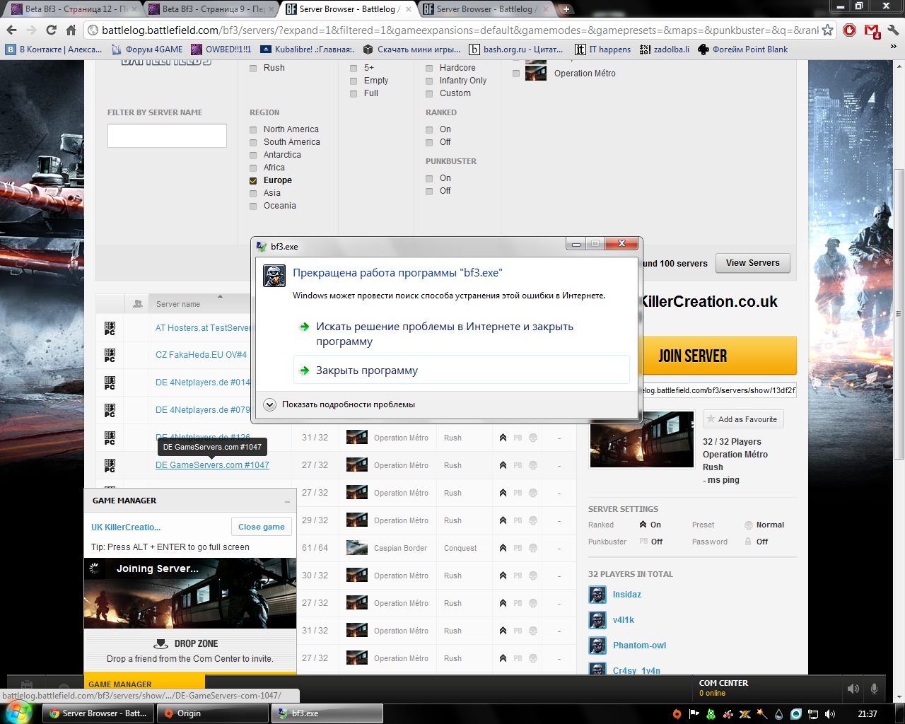 Игра не поддерживает в пути к игре русских букв поэтому нам нужно для начала переименовать имя папки где установлена игра (В моем случае C:Program FilesOrigin Games) с Бета Battlefield 3 на просто Battlefield 3!!! затем в пуске в строке поиска пишим Regedit и жмем Enter Заходим в программу реестра идем в путь Hkey_local_machine>Software>EA Games>bf3beta. Там будут файлы CDFBinary и Instal Dir кликаем на них 2 раза ищем слово Бета Battlefield 3 и просто изменяем на Battlefield 3. Затем идем в Hkey_local_machine>Software>Electronic Arts>71171> и также находим Instal Dir кликаем на него 2 раза ищем слово Бета Battlefield 3 и просто изменяем на Battlefield 3. Перезагружаем Origin и играем на здоровье) ---------- Post added at 21:46 ---------- Previous post was at 21:46 ---------- У некоторых игра не запускается, вот че я нашел, может кому надо: Игра не поддерживает в пути к игре русских букв поэтому нам нужно для начала переименовать имя папки где установлена игра (В моем случае C:Program FilesOrigin Games) с Бета Battlefield 3 на просто Battlefield 3!!! затем в пуске в строке поиска пишим Regedit и жмем Enter Заходим в программу реестра идем в путь Hkey_local_machine>Software>EA Games>bf3beta. Там будут файлы CDFBinary и Instal Dir кликаем на них 2 раза ищем слово Бета Battlefield 3 и просто изменяем на Battlefield 3. Затем идем в Hkey_local_machine>Software>Electronic Arts>71171> и также находим Instal Dir кликаем на него 2 раза ищем слово Бета Battlefield 3 и просто изменяем на Battlefield 3. Перезагружаем Origin и играем на здоровье) |