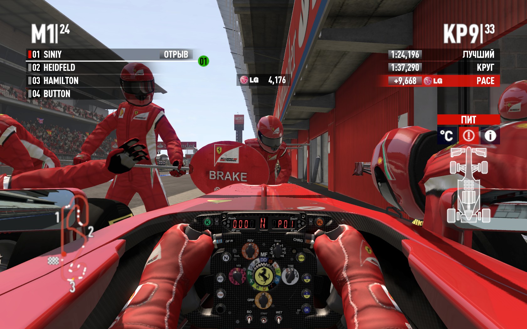 Что же такое формула 1 ? Формула 1 это большие скорости , крутые повороты, настройка болида , построение тактики гонки и командная работа. Сразу можно сказать что данный тип гонок не для всех, игра для тех кто любит перед собой ставить тяжёлые задачи и оттачивать своё мастерство. Любое гран-при(трасса) начинается с практики, в игре можно поставить полный формат гран-при(3 практики, 3 квалификации и гонка) или сокращенный(1 практика, 1 квалификация и гонка). Во время практики вам просто нужно осмотреть трассу и найти оптимальные настройки для болида, можно выбрать быстрые настройки или настроить все самому. В кампании в некоторых практиках команда будет давать вам задания, при выполнении которых вы получите улучшение к своему болиду. Квалификация, ну на квалификации вам придется постараться, нужно показать хорошее время на круге, от времени зависит ваша место на старте. Так же во время квалификации вам нужно выбрать настройки машины для гонки, для этого нужно посмотреть погоду во время гонки, т.к. после квалификации настройки машины менять уже будет нельзя. Перед стартом гонки, вам нужно выбрать стратегию ,выбрать количество пит-стопов и на какие шины вы будете переобуваться, каждые шины имеют свою скорость и время износа, если вы вошли в первую десятку на старте, то вам придется стартовать на квалификационных шинах, если нет то можете поменять на какие нужно. Можно выбрать количество кругов, есть 3 круга, 20%,50% и 100%, % это процентное количество кругов от реального гран-при. В игре очень сильно отличается поведения болида при сухой и мокрой трассе, мокрая трасса бывает нескольких видов, слабый дождик, средний и сильный. Когда стоит переменная погода и начинается дождь, а у вас мягкая или жесткая резина, начинается тихий ужас, нужно быстрей заехать на пит-стоп и сменить резину, это можно сделать быстрым меню прямо во время гонки и заехать на пит-стоп без запроса. Главной новинкой игры стала Машина безопасности(Safety car), которая выезжает когда на трассе произошла серьезная авария. При серьезной аварии выбрасывается желтый флаг с надписью SC и выезжает машина безопасности и все гонщики должны выстояться за ней и ждать когда все обломки уберут с трассы и гонка продолжиться, обгонять во время красного флага строго запрещено. http://www.youtube.com/watch?v=Jsp4-KTXUvQ Так же в игру ввели KERS и DRS. KERS – это система рекуперации кинетической энергии, в общем стоит дополнительный электро двигатель, который мы можете применять в любой момент гонки, однако есть ограничение времени применения KERS на круге, ограничено 6 секундами, обнуляется при пересечении финишной прямой на каждом круге. В Формуле 1 ограничено максимальная мощность KERS 80 лошадиными силами. Для глупых KERS это нитро которая обновляется на каждом круге. DRS - Регулируемое заднее антикрыло, при включении DRS возрастает скорость и максимальная скорость, но очень сильно падает прижимная сила задней оси, так что в поворотах лучше ей не пользоваться сразу развернет. При практике и квалификации DRS можно включать в любой момент, в гонке же есть строго определенная зона включения DRS и его можно включить только при обгоне противника, то есть DRS станет доступно, только если в зоне DRS между вами и впереди идущим соперником время отставания меньше 1 секунды. При доступности DRS вы услышите звуковой сигнал и знак DRS загорится зеленым