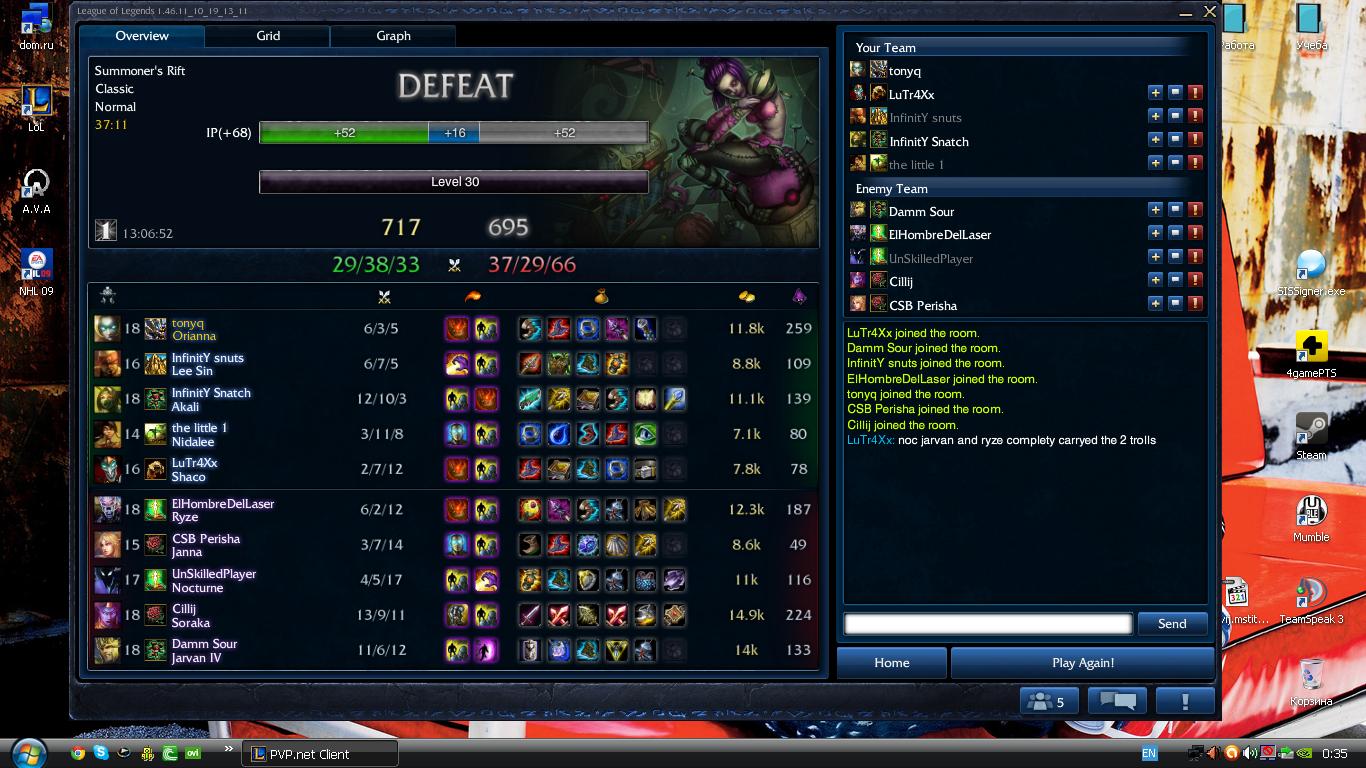 я просто не верю своим глазам, у меня в голове не укладывается как такое может быть, за что мне такие злоебучие бомжи тиммейты попадаются, было же так все охуенно неделю назад и вот опять дефит дефит дефит дефит, да ладно было бы не так обидно проигрывать если бы я чувствовал что враги реально знают что делают, но тут тупо блять какой-нибудь ебан нафидит грейвса или как в данном случае сораку, и потом тот кого нафидили ебет все что движется, это так бесит уже
