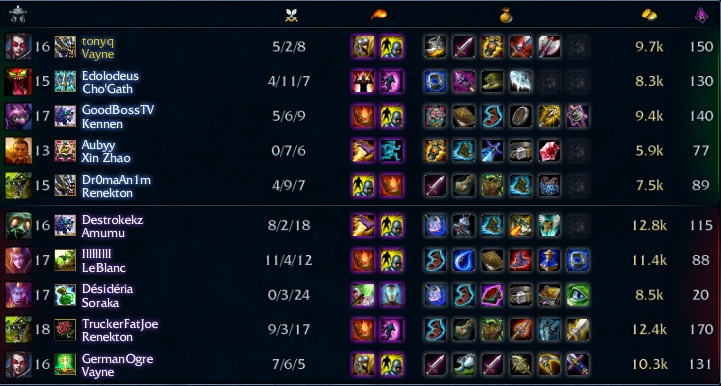 здесь просто были тотальные пиздецы поэтому этот скрин удостаивается чести быть занесенные в историю сообщений этого форума чогат - примерная мысль перед началом игры "эээ бля чо за еще промоте такое ввели, надо заценить, хм, но тогда мне придется убрать либо флэш либо телепорт, флэш - его понерфили, теперь он уже не такой спасительный, меня все-равно будут убивать с флэшем или без, возьму я лучше телепорт, чтобы быстрее возвращаться на линию" кеннен - "ебать, чемпион без маны, щас буду скилами кидаться постоянно, один хуй энергия быстро восстанавливается, возьму я лучше для этого сапоги на откат, чтобы постоянно звездочки кидать, энергия же бесконечная, буду звездопад устраивать", спустя некоторое время "чет нихуя у меня звездопад не получается, возьму вон эту морду еще, она мне еще откат понизит, еще и манареген мне даст, щас точно звездопад замучу", ближе к концу игры "на ну что блин за фигня такая, зведопад устроил, а убить никого не могу!!!!! дурацкий чемпион" ксин - "короче до 18 лвла никого не ганкаю, меня не ебет, мне отжираться надо", спустя какое время, прочтя описание скилов "о, у меня прыгалка зависит от ап...ебать....да я жеее... МААААААГ!!!! а магам нужны итемы на ап и ману, возьму-ка я этот синий меч, он и ману дает и ап дает еще и красивенький такой" ренектон - "я крокодил идите все нахуй, и похуй что я самый тут толстый, в замесе я влетаю самый последний, после вейн" вейн - "бляяяяяять!!!! как же меня эти сучары заебали, один фидит, другой фидит, третий нихуя не дамажит, еще и этот крокодил нихуя не делает стоит всегда за моей спиной" |