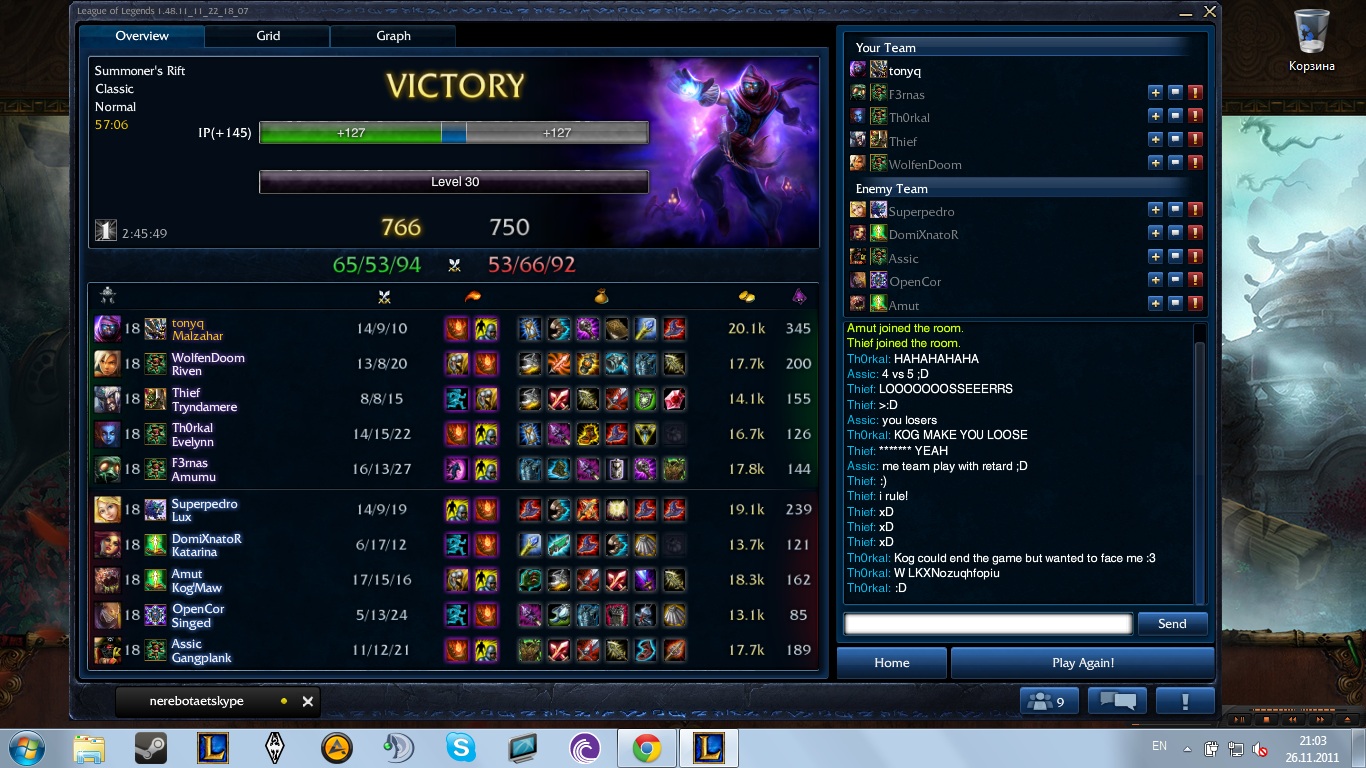 вся фишка в том что нас полностью пропушили, сделали эйс, когмав остался добивать нексус, тут респится ева, в это время по нексусу остается нанести 2 удара, ког вместо того чтобы добить нексус решил сделать фраг на прощание, но не тут то было, ева его наказала анально мы ебанули контр пуш, эйс, потом еще раз эйс, и потом крыса мальзахар забэкдорил и уничтожил нексус всю игру играли вчетвером, сперва ривен минут до 20 ливала, потом трында сказал мне надо идти и ушел, приперся лишь на последних минутах игры, еще и 2 фрага успел сделать напоследок |