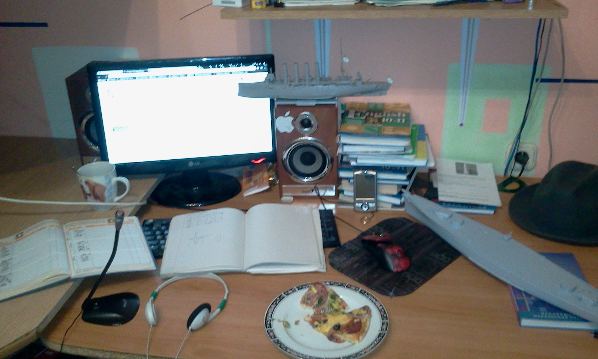 все в основном стандарт, ну мышка разве что X7 от брата досталась(я её ебал, как на ней руки потеют), колонки, наушники хуйня ебаное, но в колонках сидеть часто не резон, дохера учебников за 11(некоторые 10-11) класс, а около них мой любимый HTC Love 2007 года выпуска, с рук брал ибо свой сдох. Кружка(стандарт), пицца(домашняя кстати), кораблик клееный. Люблю клеить модельки. Обожаю. Эту модель мне подарила теперь уже бывшая девушка, собрал её за...5 часов наверное. Крейсер ВарягЪ... А вон большое днище от лодки(там где то видно сбоку) это я буду собирать Линкор Бисмарк(бывший немецкий, ныне подводный), масштаб вроде 1 к 250. Вон дневник, нету там двоек уже месяц наверное(да и хороших оценок тоже нету, пустой). И шляпа. Просто серая шляпа.