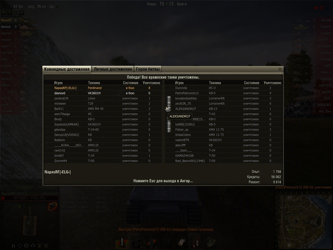---------- Post added at 23:07 ---------- Previous post was at 22:47 ---------- Победа! Бой: Эль-Халлуф 4 марта 2012 г. 22 19Танк: ИС-7 Получено опыта: 1890 Получено кредитов: 87414 Достижения в бою: «Стальная cтена», «Воин», Медаль Бёльтера, «Снайпер» |