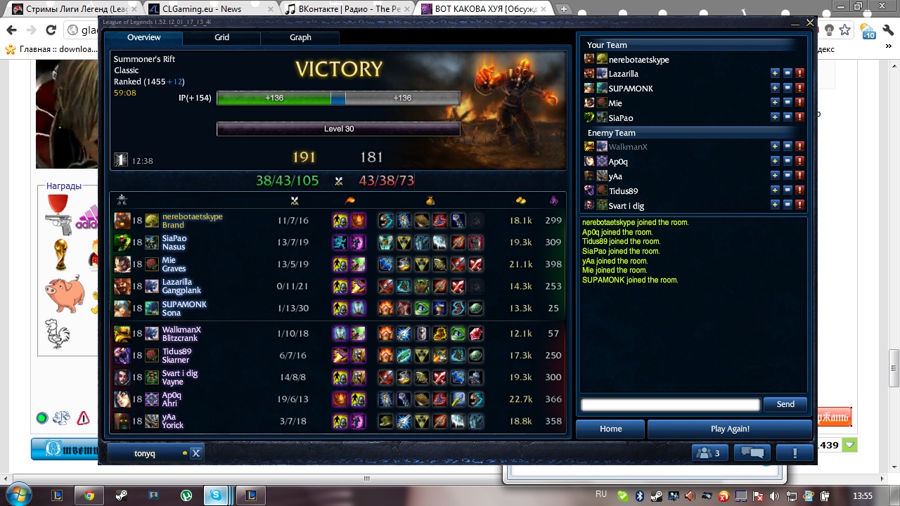 Я сосал как всегда ахри на миде(всегда фэйлю против ахри)имею что то вроде 1-5 только грейвс имеет нормальный счет(2-1:D) по началу казались конченными придурками,но нашли в себе силы и затащили бомжей,ахри имела 12-1,потом резко вот так)не потерял веры в раков еще))