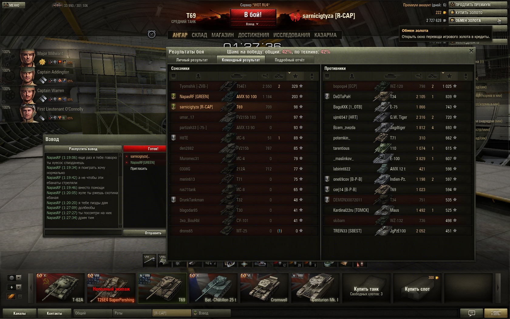Катать 50 100 и Т69 взводом просто нереально охуенно. Можно нагибать неразгибая 90% игроков противника, были бы команды, конечно, в меру адекватные ![]() И охуенная батруха от Напаса