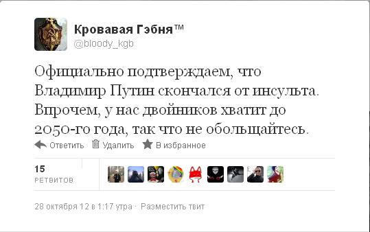 На сосаче появился топик, мол В.В. Путин умер, о чем свидетельствуют такие факты, как то, что на сайте первого телеканала за весь день нет ни единого упоминания о президенте РФ, чего не было за довольно большой срок. Так же, по некоторым сообщениям внезапно президент отложил свои поездки в Индию, Пакистан и Турцию, под предлогом того, что болит спина. При этом нет никаких комментариев со стороны самого Путина. При этом другие политические лидеры моментально активизировались, так на днях кукарекал Прохоров, о чем везде писали и гудели, недавно Зюганов, Митрофанов и Миронов решили поорать на всю страну. При том по телевизору нам мылят мозги всяким говном, ситуация напоминает просто - тупик, какое то странное замыливание.