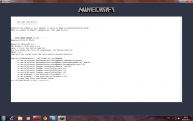 ----------------------- Minecraft was unable to start because it failed to find an accelerated OpenGL mode. This can usually be fixed by updating the video card drivers. --- BEGIN ERROR REPORT 7fe0271 -------- Generated 10.12.11 21:08 Minecraft: Minecraft 1.0.0 OS: Windows 7 (x86) version 6.1 Java: 1.6.0_29, Sun Microsystems Inc. VM: Java HotSpot(TM) Client VM (mixed mode), Sun Microsystems Inc. LWJGL: 2.4.2 [failed to get system properties (java.lang.NullPointerException)] org.lwjgl.LWJGLException: Pixel format not accelerated at org.lwjgl.opengl.WindowsPeerInfo.nChoosePixelForma t(Native Method) at org.lwjgl.opengl.WindowsPeerInfo.choosePixelFormat (WindowsPeerInfo.java:52) at org.lwjgl.opengl.WindowsDisplay.createWindow(Windo wsDisplay.java:185) at org.lwjgl.opengl.Display.createWindow(Display.java :311) at org.lwjgl.opengl.Display.create(Display.java:856) at org.lwjgl.opengl.Display.create(Display.java:784) at org.lwjgl.opengl.Display.create(Display.java:765) at net.minecraft.client.Minecraft.a(SourceFile:237) at net.minecraft.client.Minecraft.run(SourceFile:644) at java.lang.Thread.run(Unknown Source) --- END ERROR REPORT 377fdf43 ---------- |